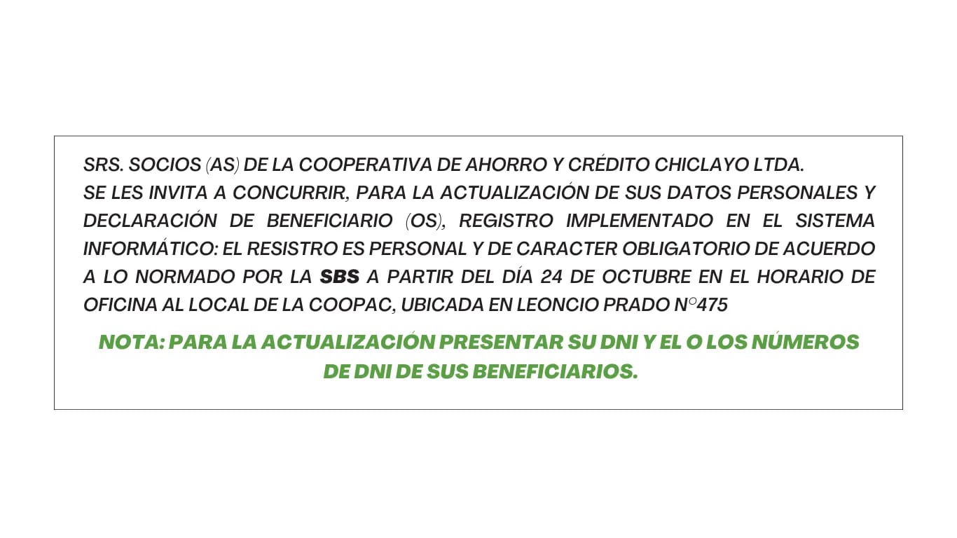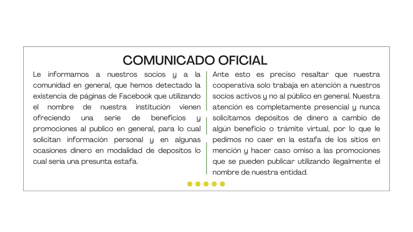 Ante esto es preciso resaltar que nuestra cooperativa solo trabaja en atención a nuestros socios activos y no al público en general. Nuestra atención es completamente presencial y nunca solicitamos depósitos de dinero a cambio de algún beneficio o trámite virtual, por lo que le pedimos no caer en la estafa de los sitios en mención y hacer caso omiso a las promociones que se pueden publicar utilizando ilegalmente el nombre de nuestra entidad.